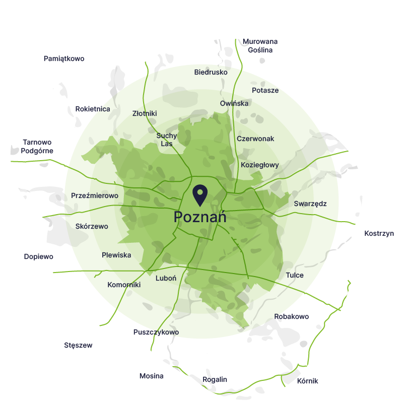 W Poznaniu kontenery na gruz dostarczamy zwykle w mniej niż 24 godziny. Szybką realizację oferujemy w granicach administracyjnych miasta, a także w okolicznych miejscowościach (między innymi w Luboniu, Swarzędzu, Suchym Lesie, Złotnikach, Rokietnicy czy Tarnowie Podgórnym).
